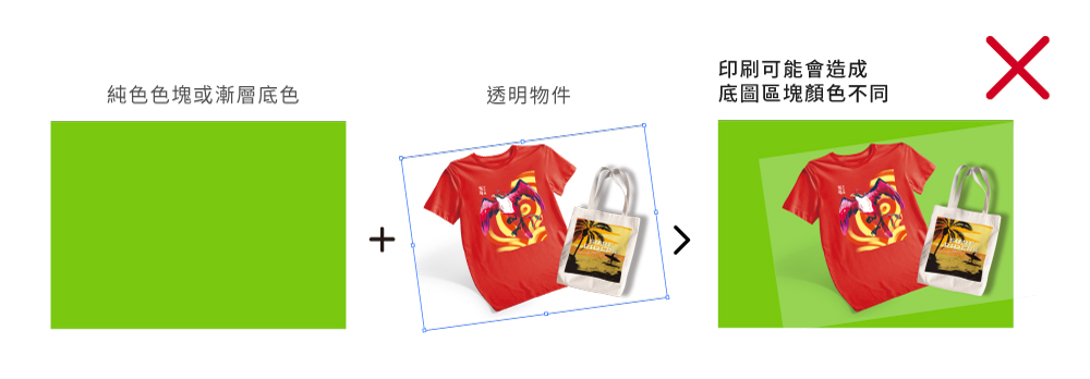 ▲ 設計原稿填色為K100(圖左),印刷結果會變成黑色直壓(圖右)